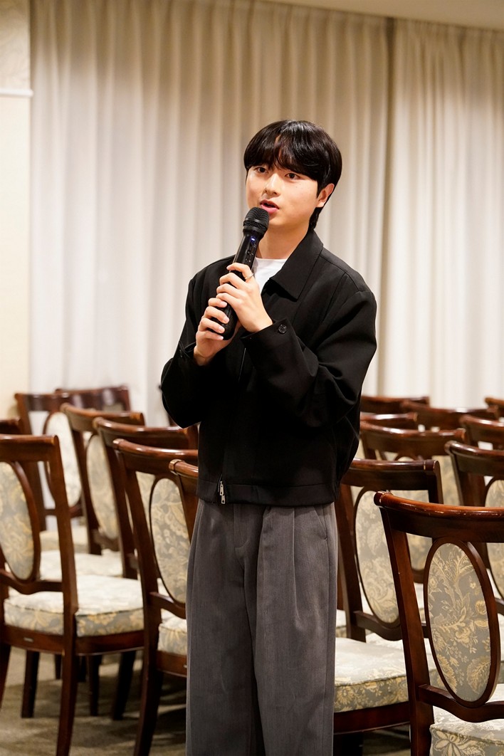 歓談で会場が和やかな雰囲気に包まれた後、プログラム生代表のイ・ウォンジェさんがスピーチを行いました。4月の開講式で先生方から贈られた「一年はあっという間。 日本でしかできない経験を」という激励の言葉を振り返りながら、来日当初は日本語で思いを伝えることが難しかったが、今はこうして気持ちを伝えられるようになったこと。 そしてその成⾧が先生方の熱心な授業とチューターの支えによるものだと語り、教職員・チューターへの感謝の思いを伝えました。