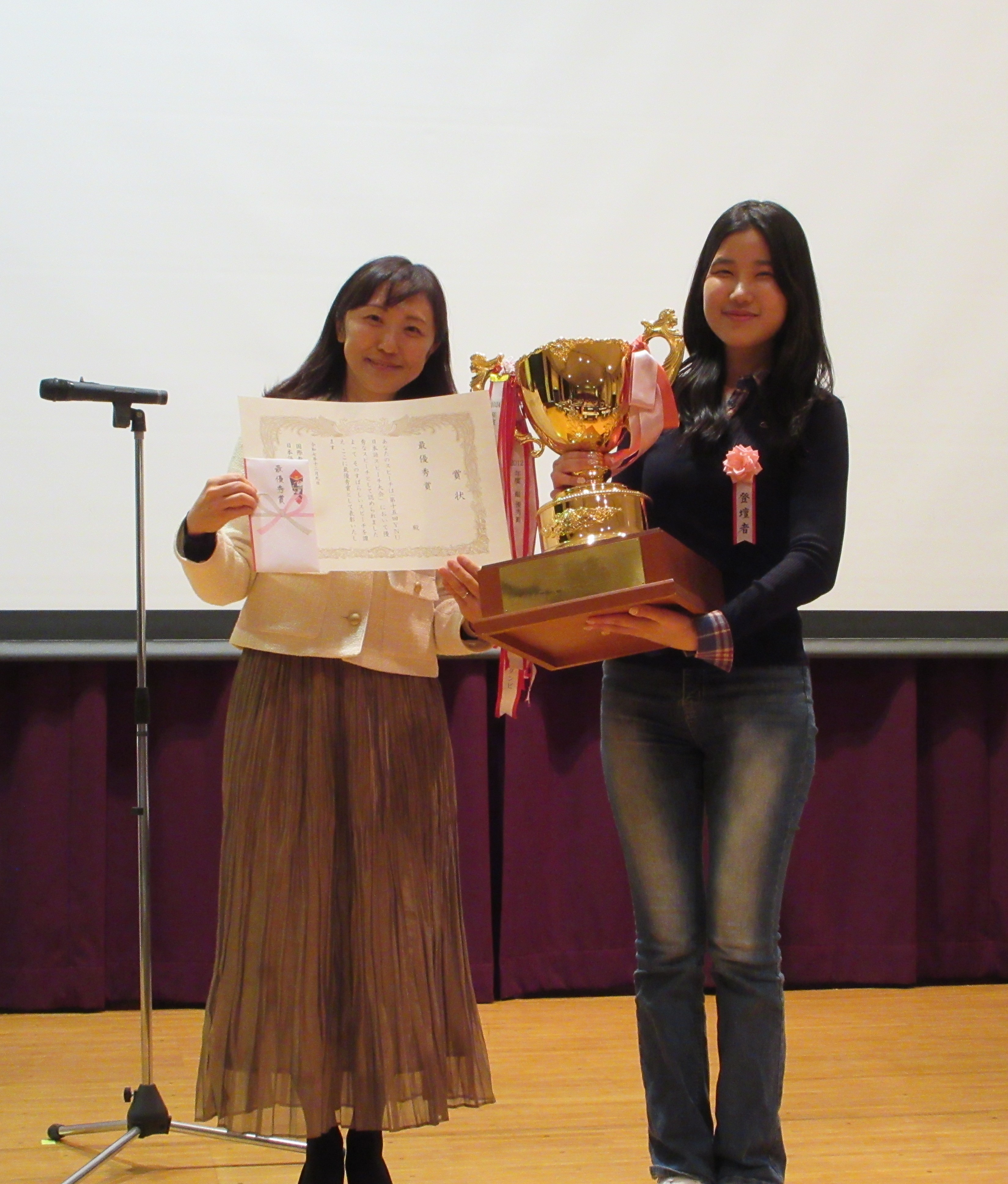 今回のスピーチ大会は、私にとって初めて日本で参加したスピーチ大会でした。大好きだった日本という場所で、そして自分が本当に好きな日本語を使ってスピーチができたことは、今でも強く心に残っています。スピーチを通して、「昔の自分へ伝えたいこと」というテーマのもと、自分自身について改めて考え、それを言葉に整理して伝えることができた点も、非常に貴重な経験でした。また、今回の大会で最優秀賞をいただき、日本の新聞にも掲載していただいたことは、自分にとって大きな励みとなり、この経験の重みを改めて感じるきっかけになりました。緊張や不安もありましたが、それ以上に「伝えることの楽しさ」や「言葉の力」を実感でき、日本でのこの経験は、これからの自分を支える大切な原動力になると思います。このような素晴らしい機会をいただけたことに、心から感謝しています。ありがとうございました!